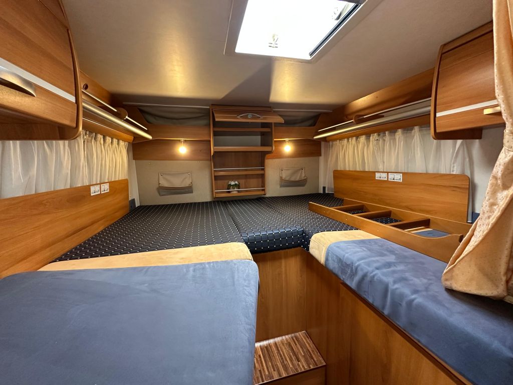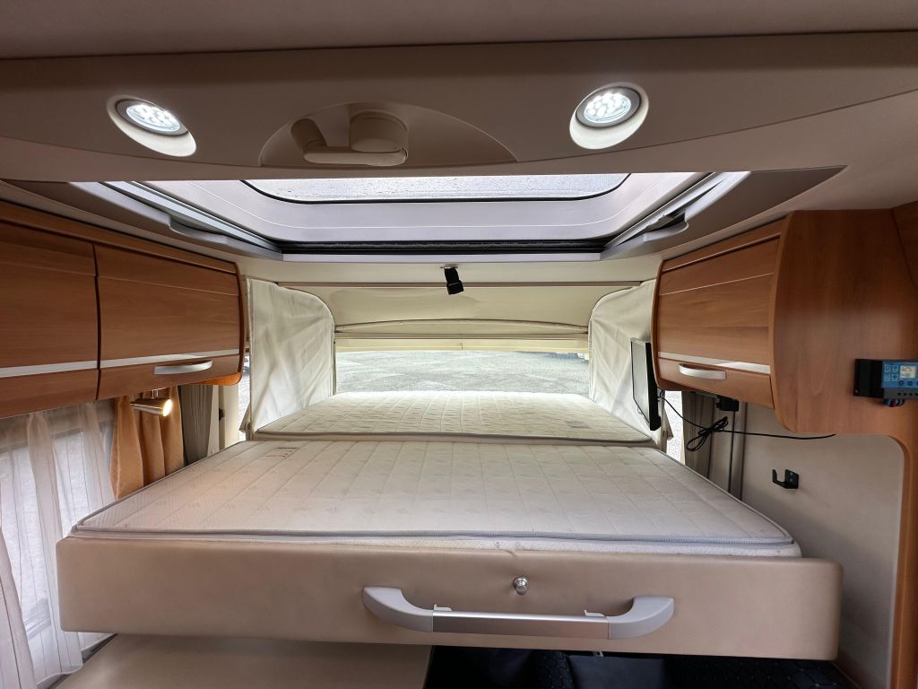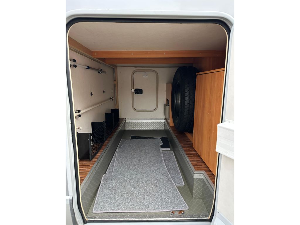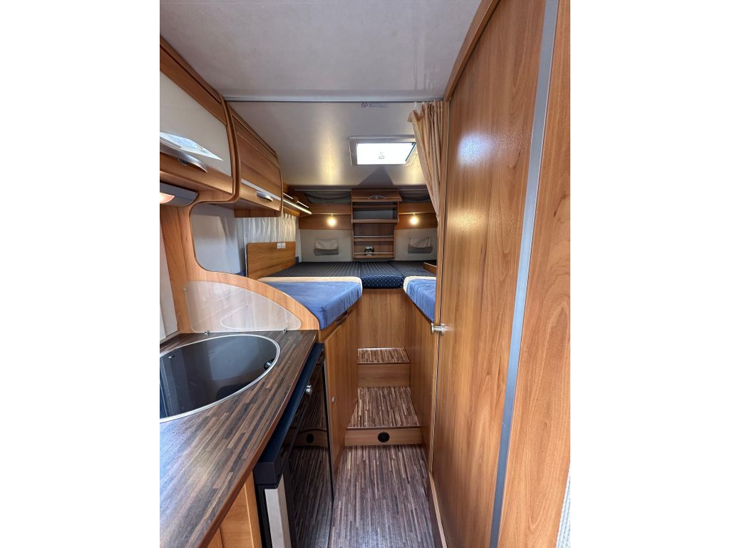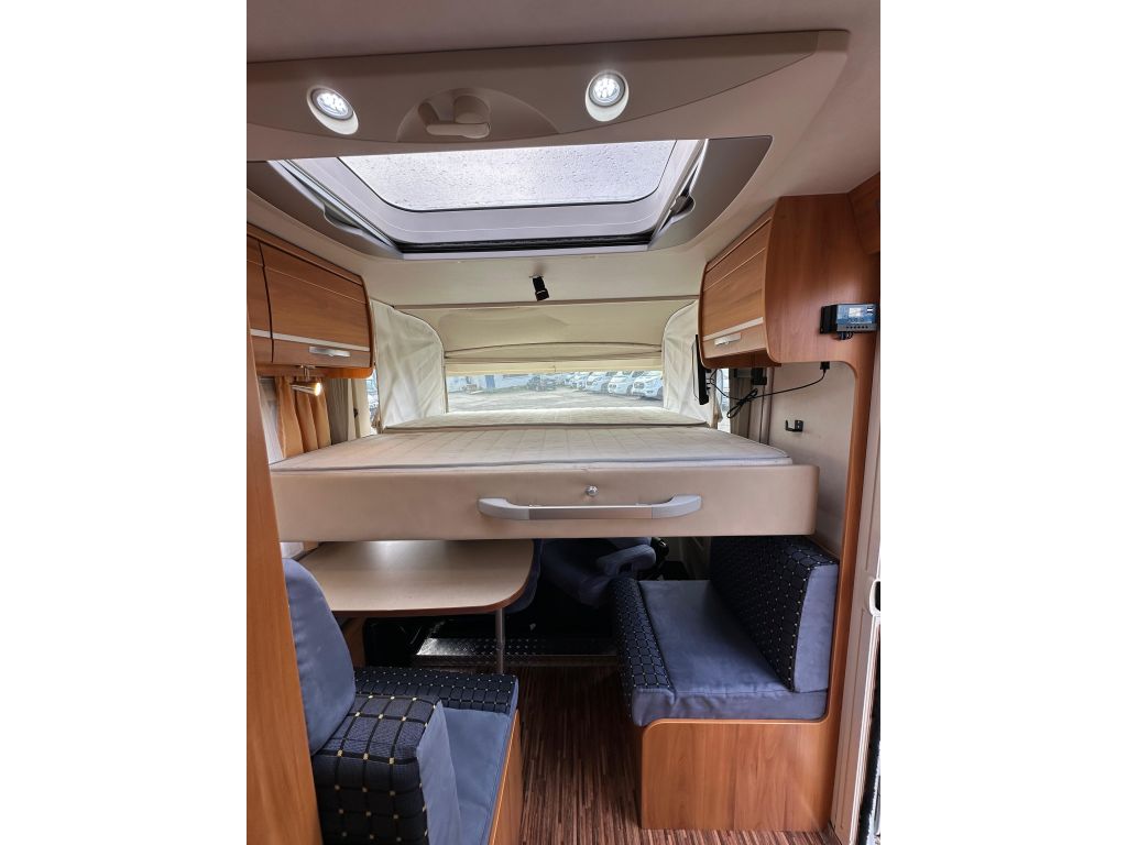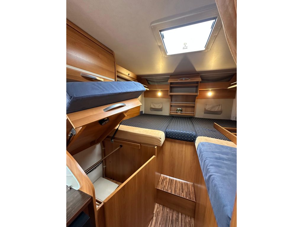 Esta autocaravana integral de tan solo 6.73m, ofrece una distribución muy versátil. Cuenta con* camas gemelas traseras*, con la posibilidad de ampliar a una cama de matrimonio de 191X193cm. Dispone de un gran almacenamiento bajo la cama izquierda con apertura vertical. La cama de cabina , tiene dos opciones de apertura, siendo la común con unas medidas de 140x 174cm . Haciendo la apertura de dicha cama obtenemos una medida mayor de 200x174 cm sin llegar a limitar el salón en su totalidad. También cuenta con otra cama adicional en la mesa del salón. En este vehículo pueden llegar a dormir más de cinco personas, aunque para viajar solo permite cuatro. Este vehículo cuenta con el baño modul-space dejando una zona muy amplia en la ducha y una mayor comodidad para el uso del aseo. Dispone de un armario amplio y una claraboya en techo que aporta gran luminosidad. El garaje es amplio , con capacidad para almacenar la rueda de repuesto. Permite un cómodo acceso a las bombonas y dispone de cestas de almacenaje.