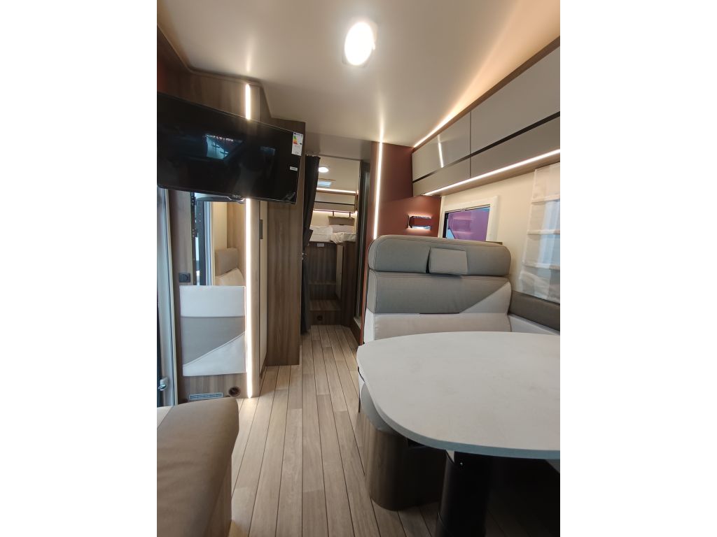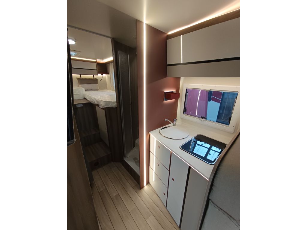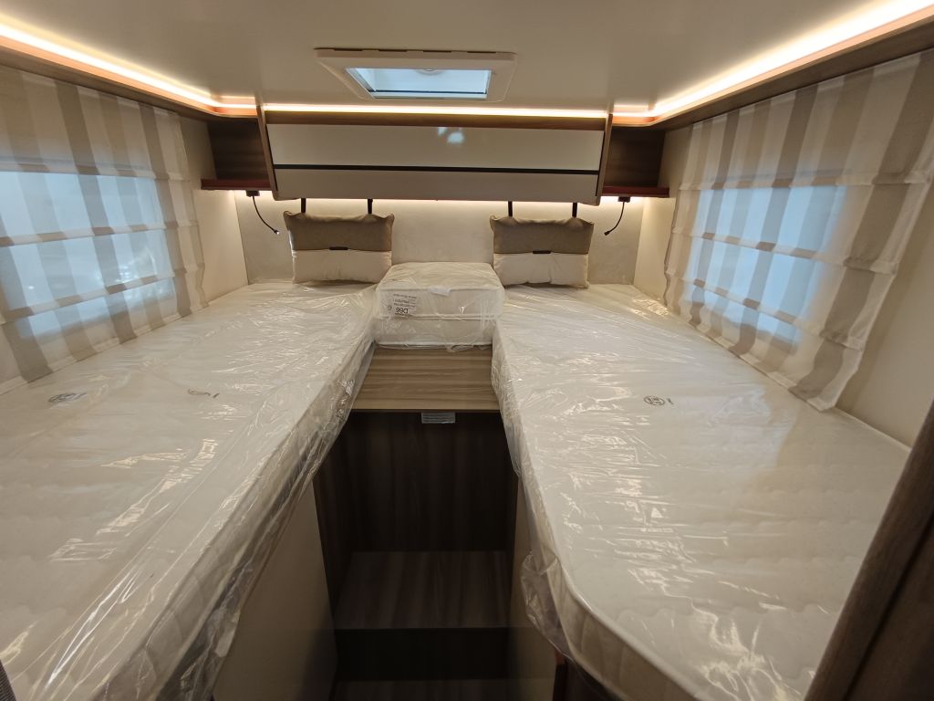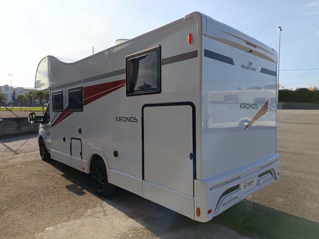La Roller Team Kronos 284 M es la autocaravana perfecta para familias aventureras gracias a su quinta plaza homologada. Su distribución con camas gemelas traseras convertibles en cama de matrimonio extra grande sumada a la cama delantera doble sobre la cabina la convierte en el vehículo familiar perfecto para vivir grandes aventuras de la manera más confortable. Otro de los puntos fuertes de esta autocaravana perfiladas es la zona de aseo y ducha independientes proporcionando mayor privacidad a sus ocupantes.