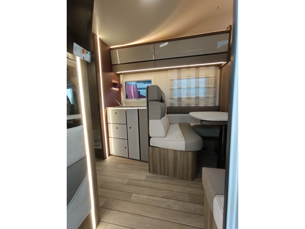 La zona de día de la Roller Team Kronos 284 M es un espacio multifuncional que permite hacer vida cotidiana en el interior gracias a su disposición en L el espacio en el salón es amplio y permite alojar a varias personas. La mesa es regulable en altura y móvil permitiendo convertir el salón en comedor o en zona de estar según convenga. Para ello dispone de: