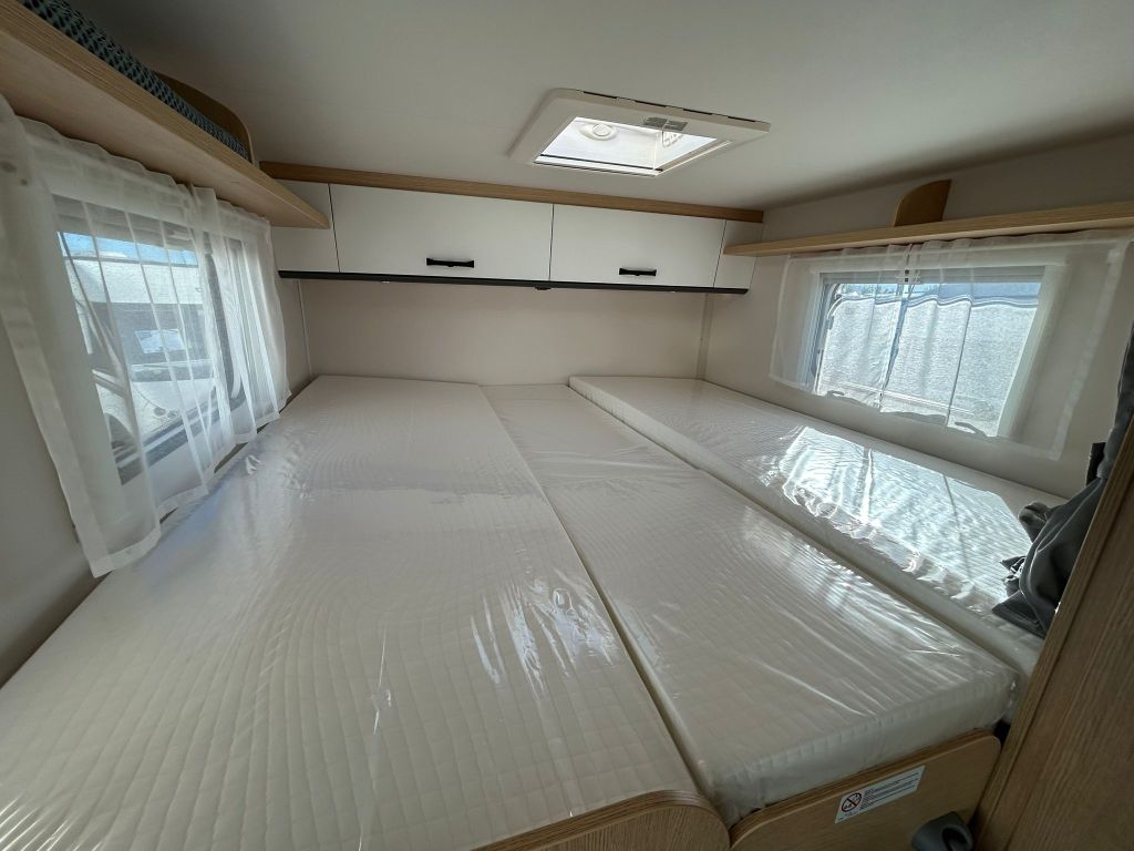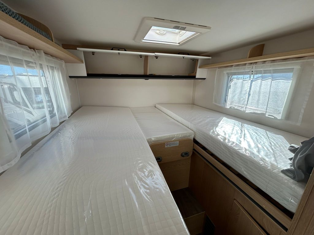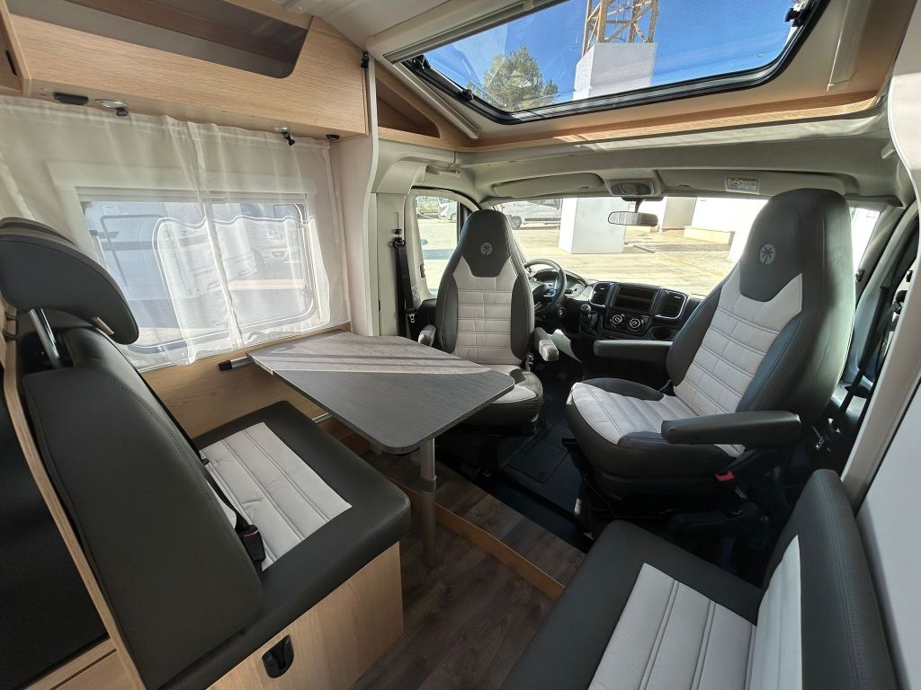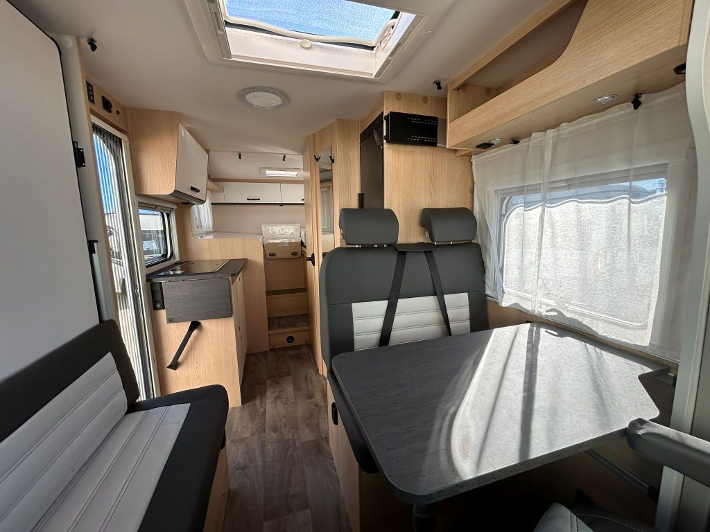 Autocaravana compacta perfilada de tan solo 699m , con camas gemelas y cama basculante en el salón con hasta 4 plazas para viajar , comer y dormir