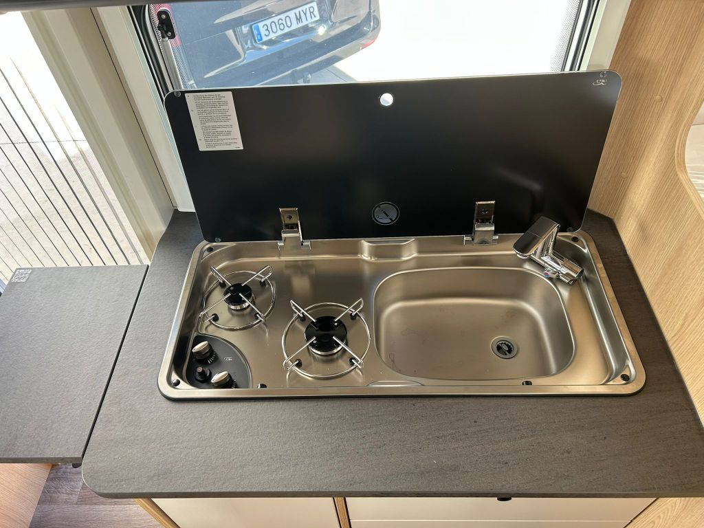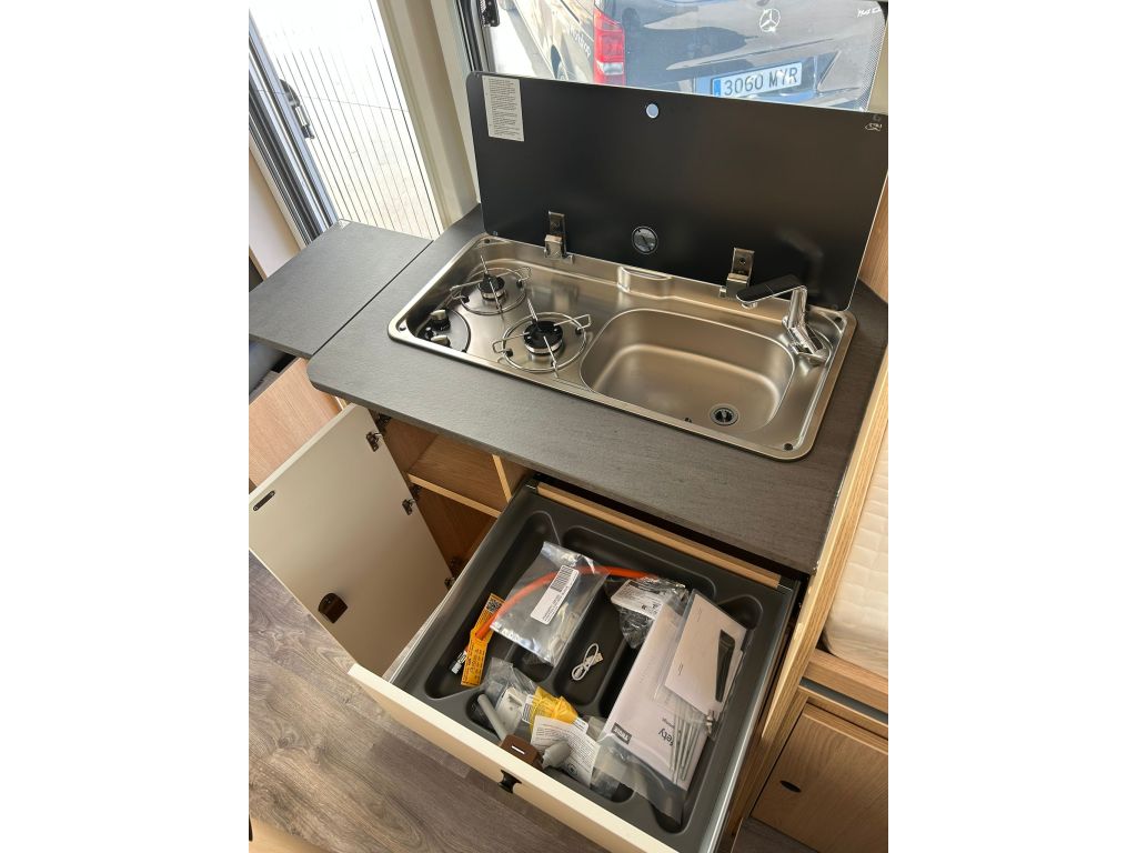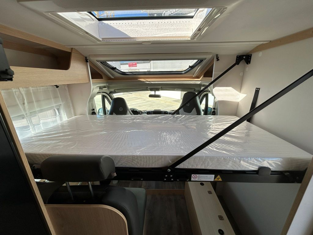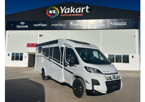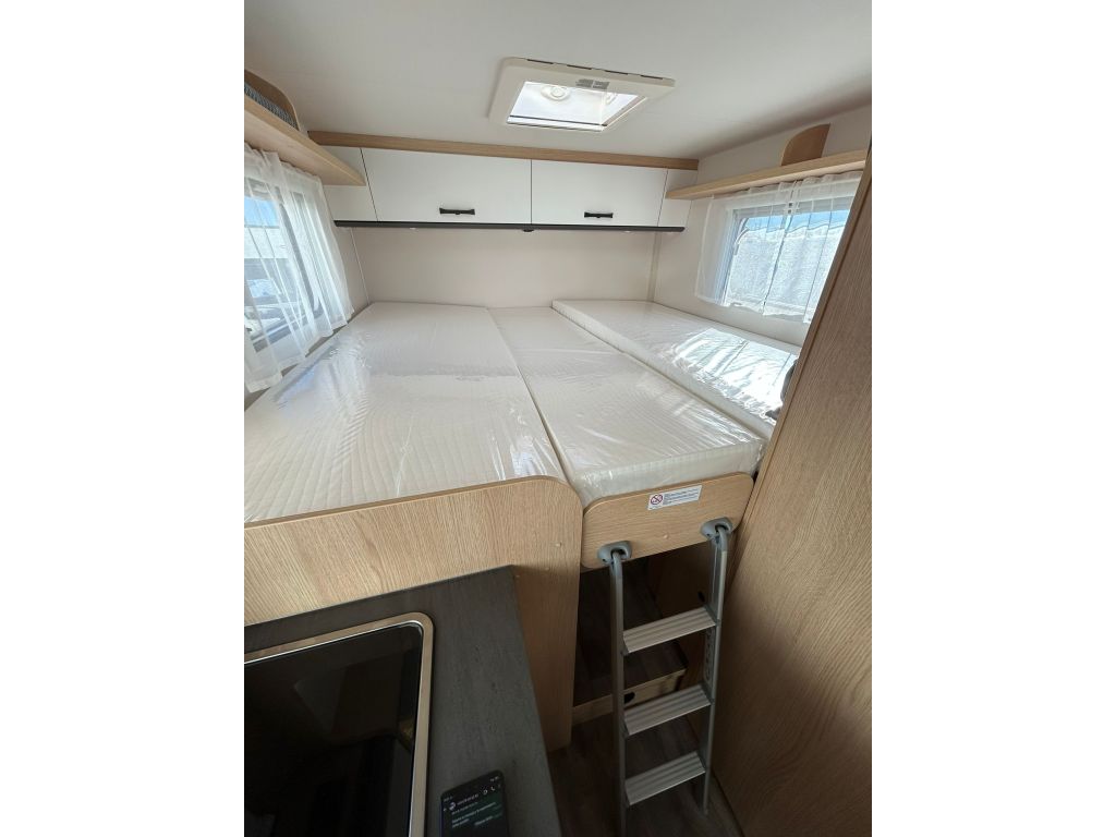 Autocaravana compacta perfilada de tan solo 699m , con camas gemelas y cama basculante en el salón con hasta 4 plazas para viajar , comer y dormir