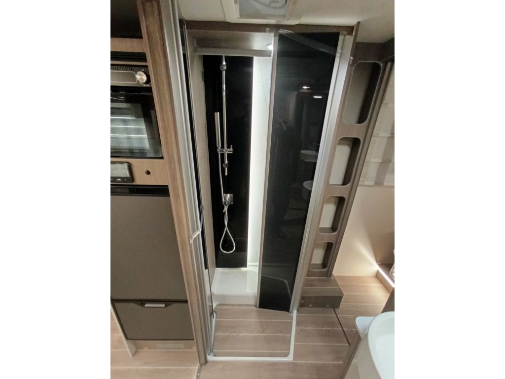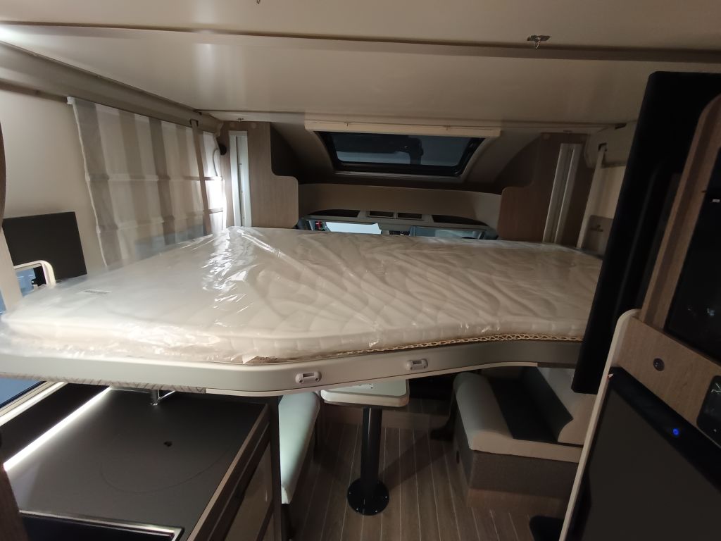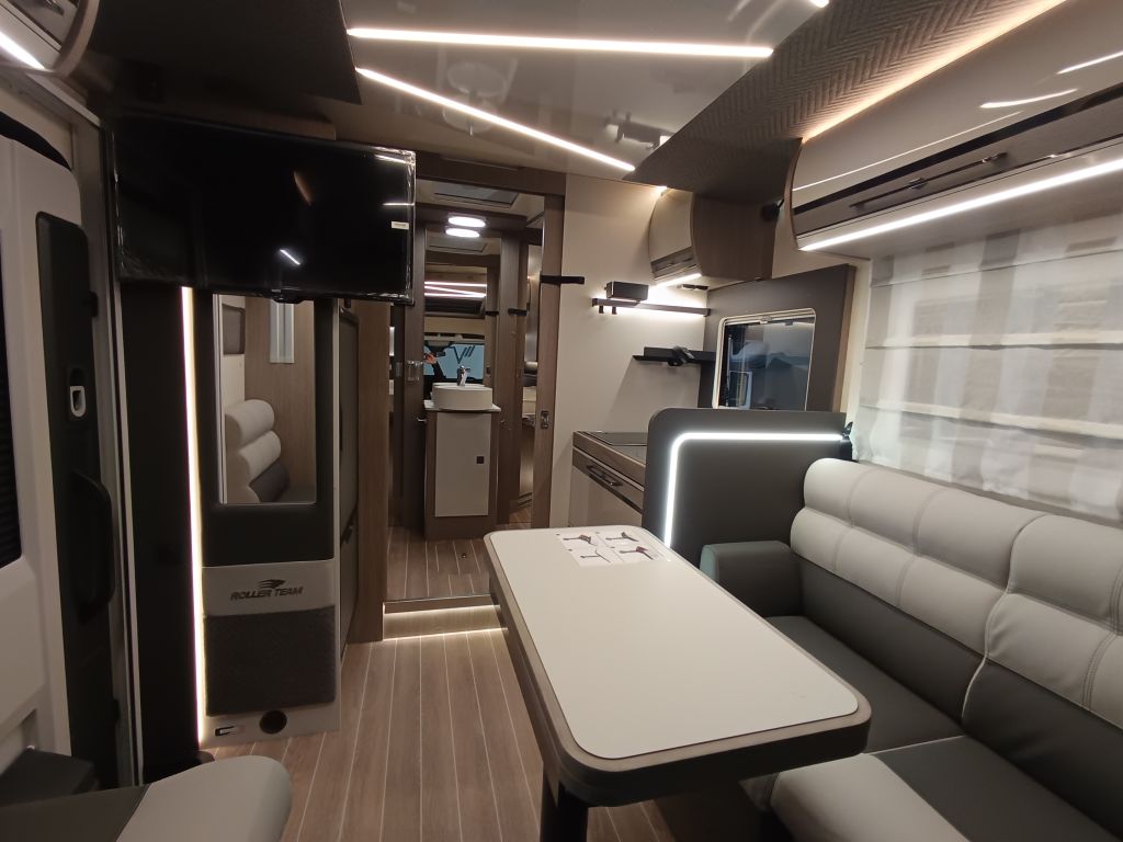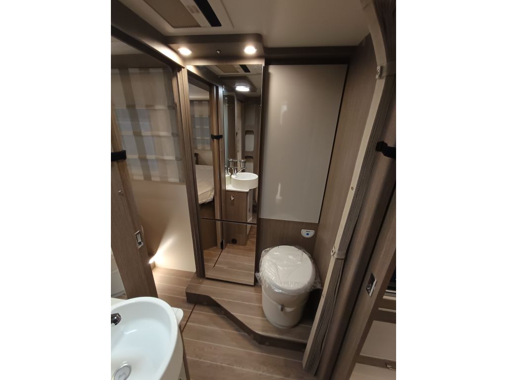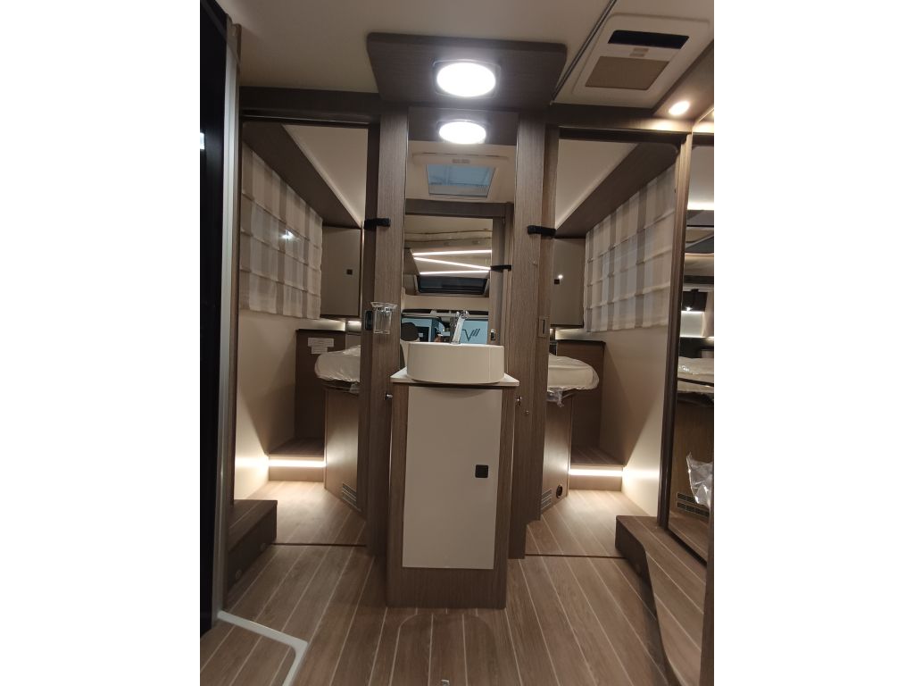 Autocaravana perfilada ROLLER TEAM de cama isla y su caracteristico cuarto de baño completo , generando 3 ambientes independientes y privados