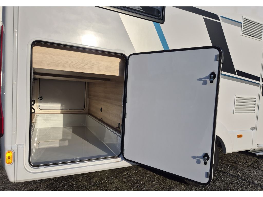 En su interior destaca un salón amplio y luminoso, con asientos enfrentados y mesa plegable, con capacidad para hasta 5 comensales, creando un espacio cómodo y acogedor tanto en ruta como en parada. El garaje de grandes dimensiones permite transportar y almacenar todo el equipaje y material necesario de forma segura, incluso en viajes largos.