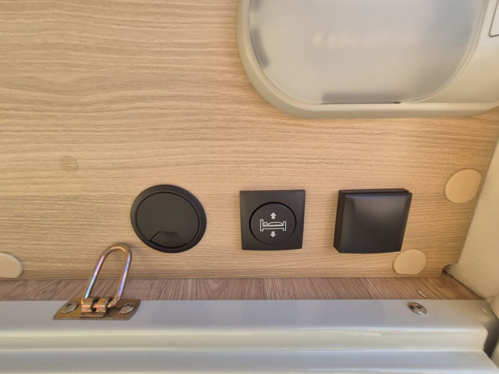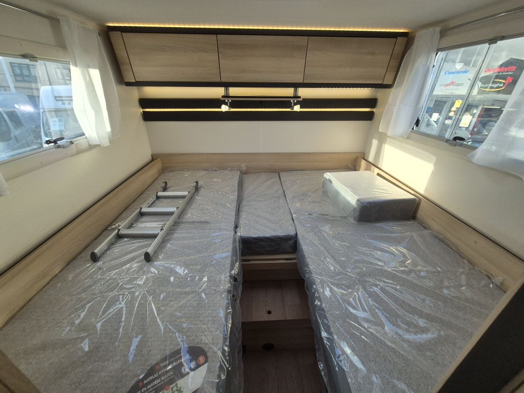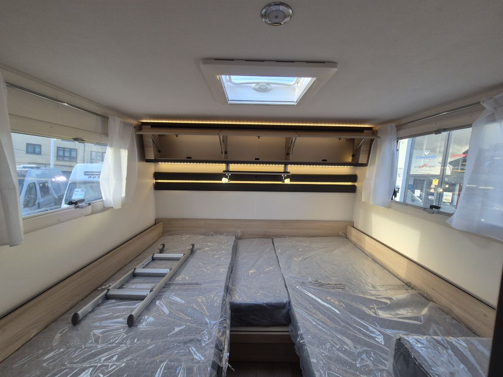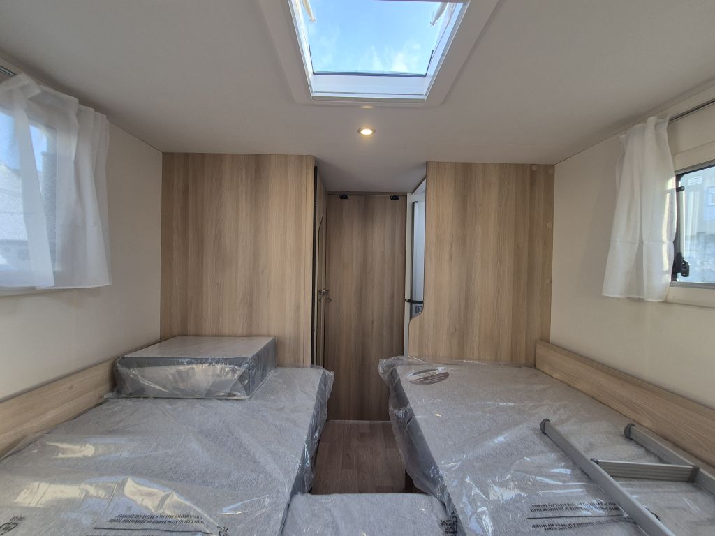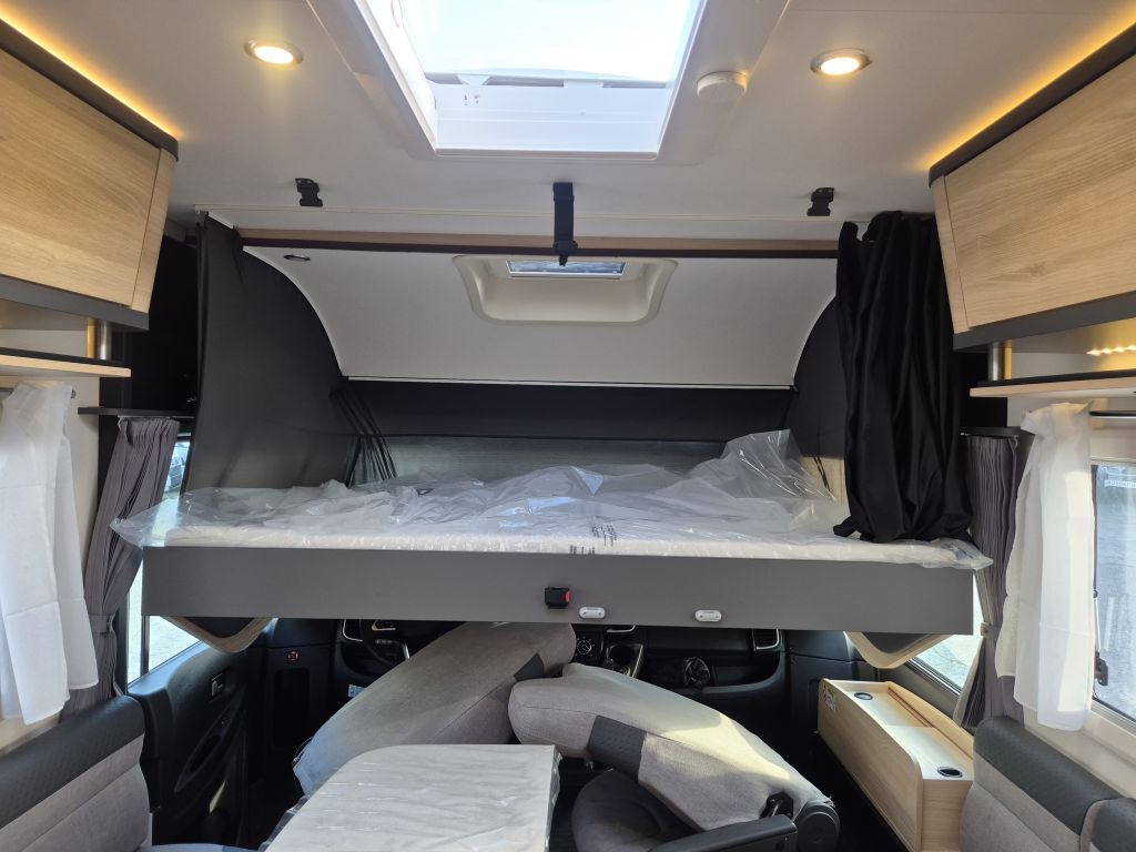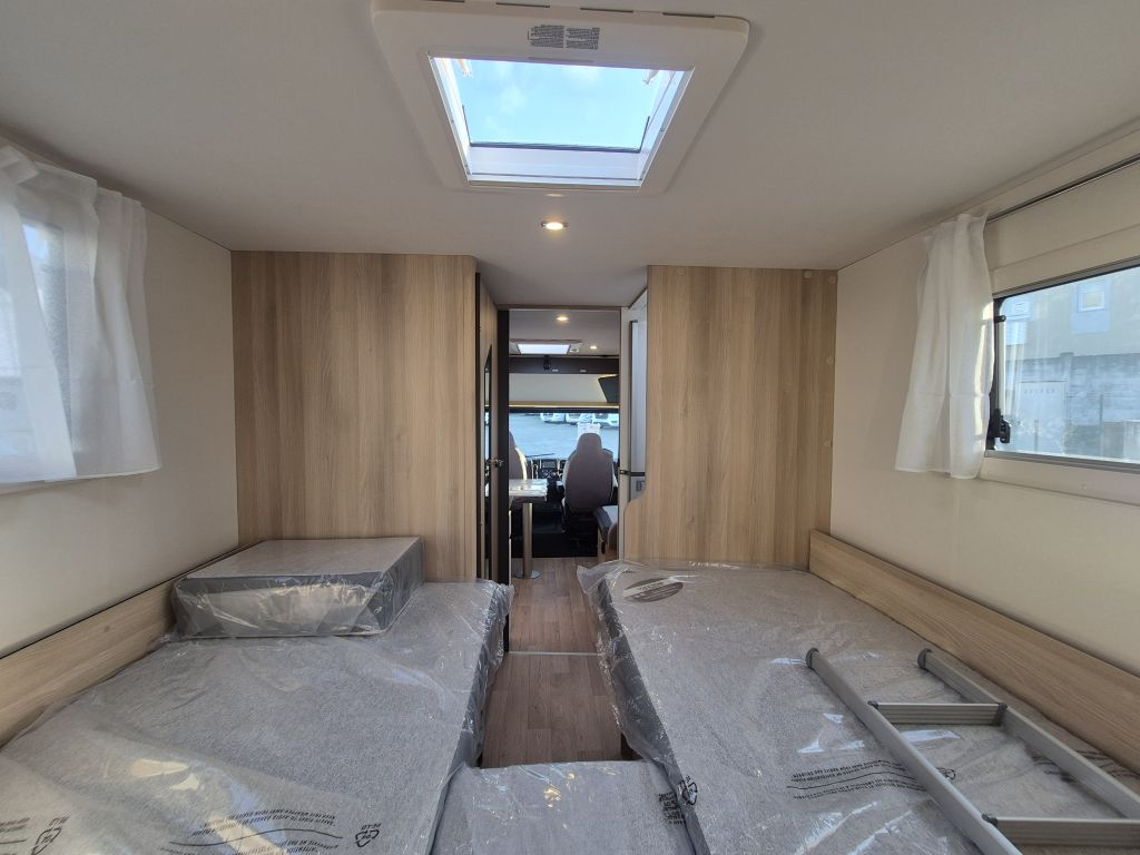 Uno de los grandes atractivos de la Itineo JC740 es su distribución con camas gemelas traseras, regulables en altura eléctricamente, que pueden transformarse fácilmente en una cama King Size de 160 x 217 cm, ofreciendo un descanso excepcional y una gran versatilidad en el espacio.