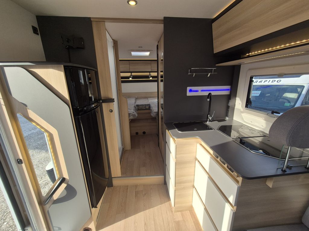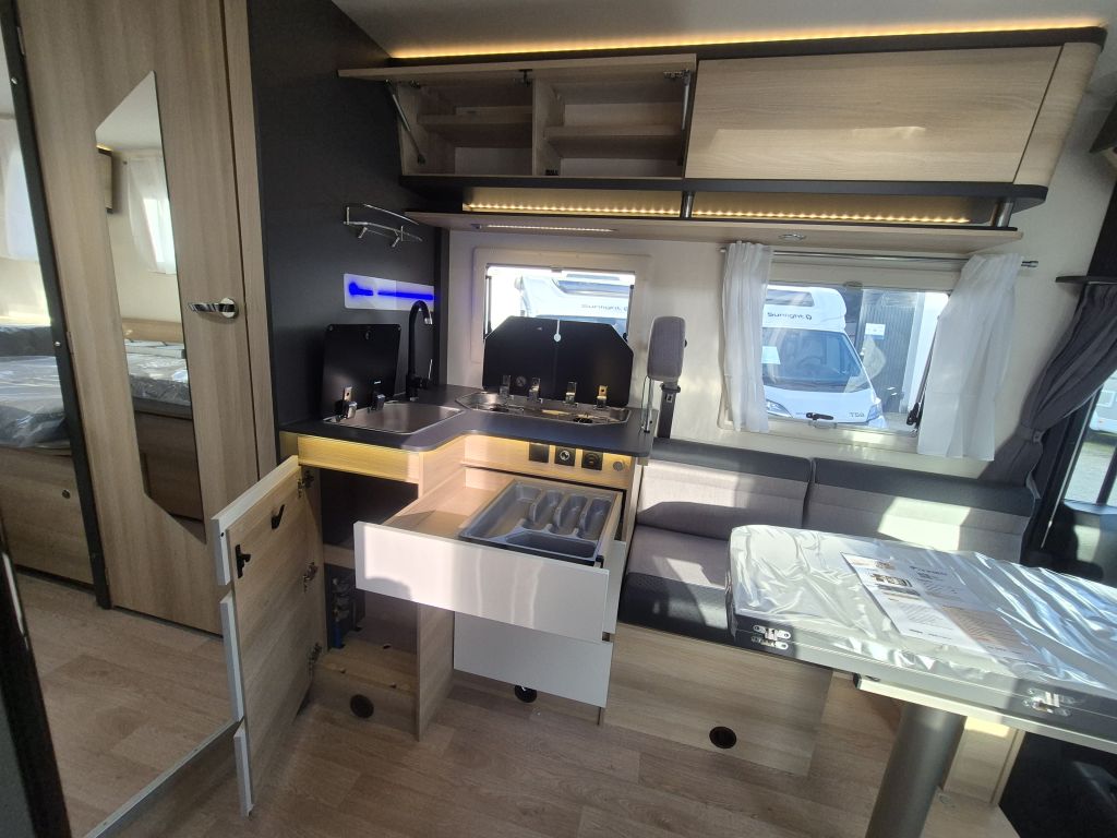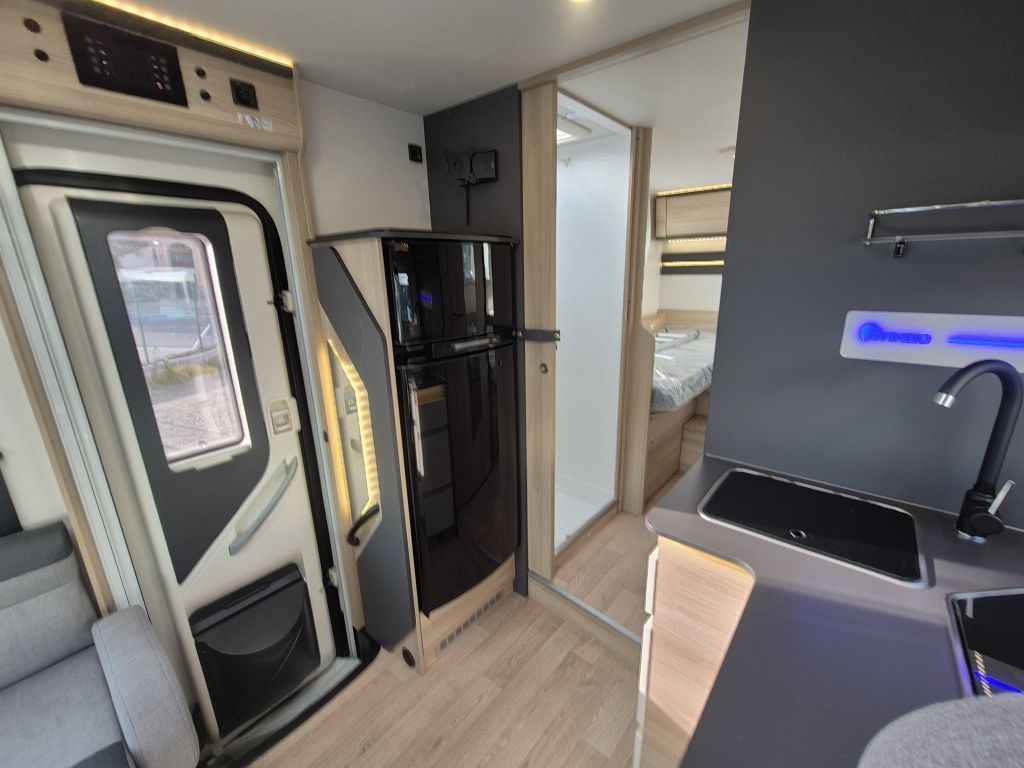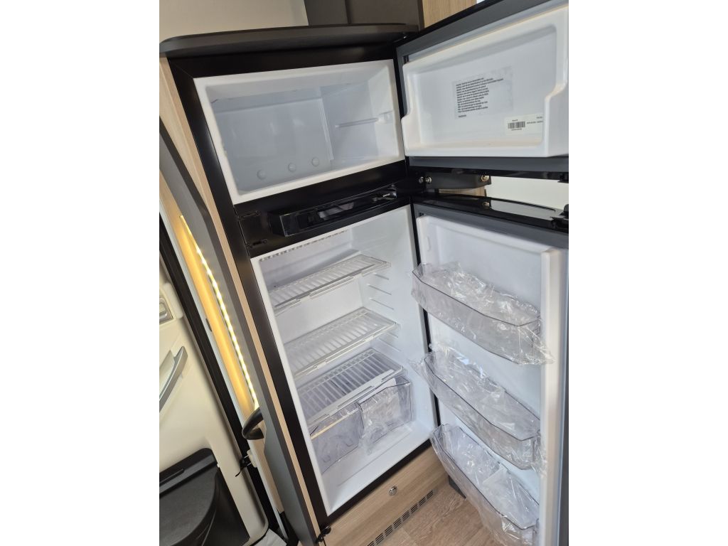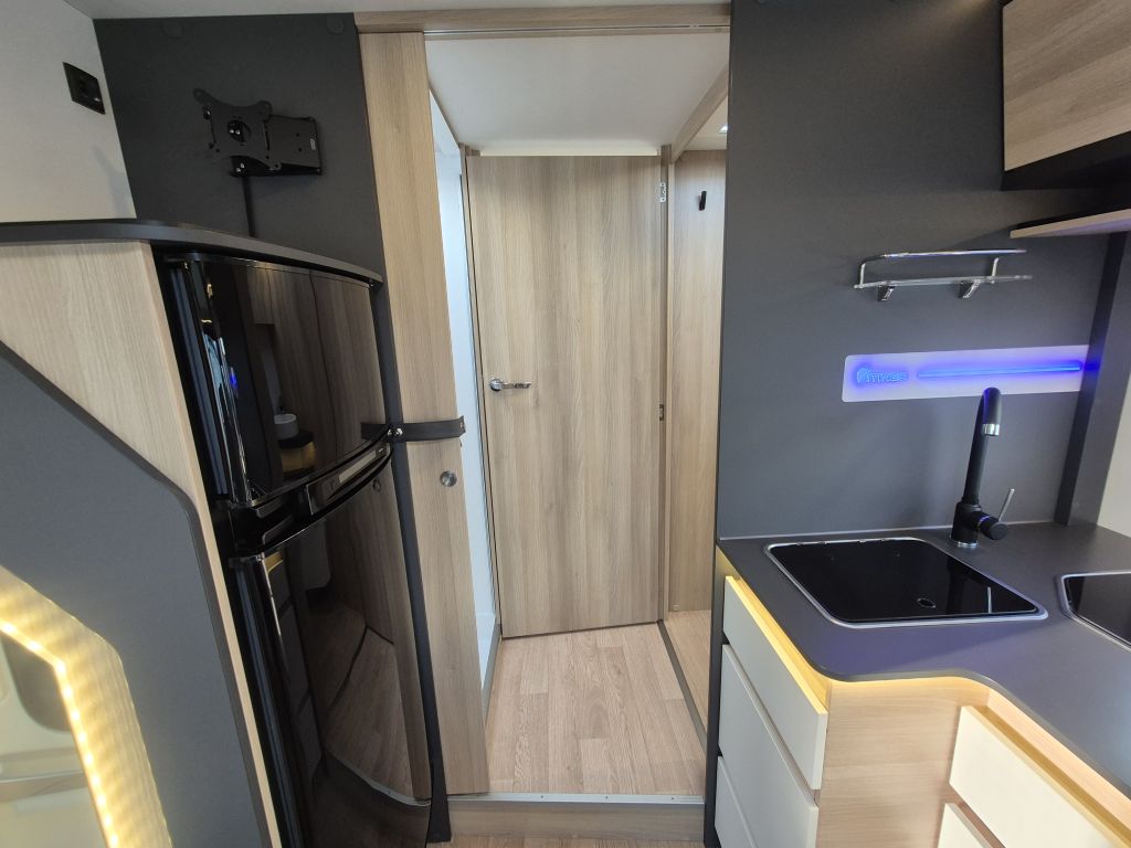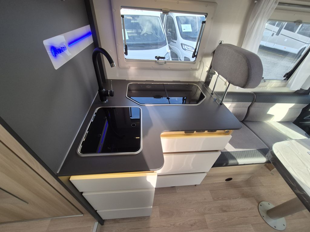 La cocina de la Itineo JC740 está diseñada para ofrecer funcionalidad, diseño y comodidad en cada detalle. Dispone de extensión de encimera, banda acrílica lateral con retroiluminación LED azul y portaespecias, optimizando el espacio y facilitando el uso diario. Incorpora un cajón cacerolero con freno al final del recorrido, fregadero de acero inoxidable con tapa de cristal negro brillante y cierre centralizado en los cajones, garantizando seguridad y practicidad durante la marcha. El equipamiento se completa con un grifo de latón con cartucho cerámico y una cocina de acero inoxidable de dos fuegos, con tapas negras independientes y encendido piezoeléctrico. Para una mayor autonomía, cuenta con un frigorífico de 145 litros, con selección automática de energía y puerta doble, además de obturadores de protección para el invierno en las rejillas exteriores del frigorífico, asegurando un rendimiento óptimo en cualquier época del año.