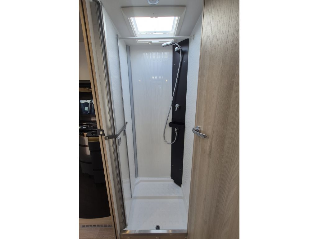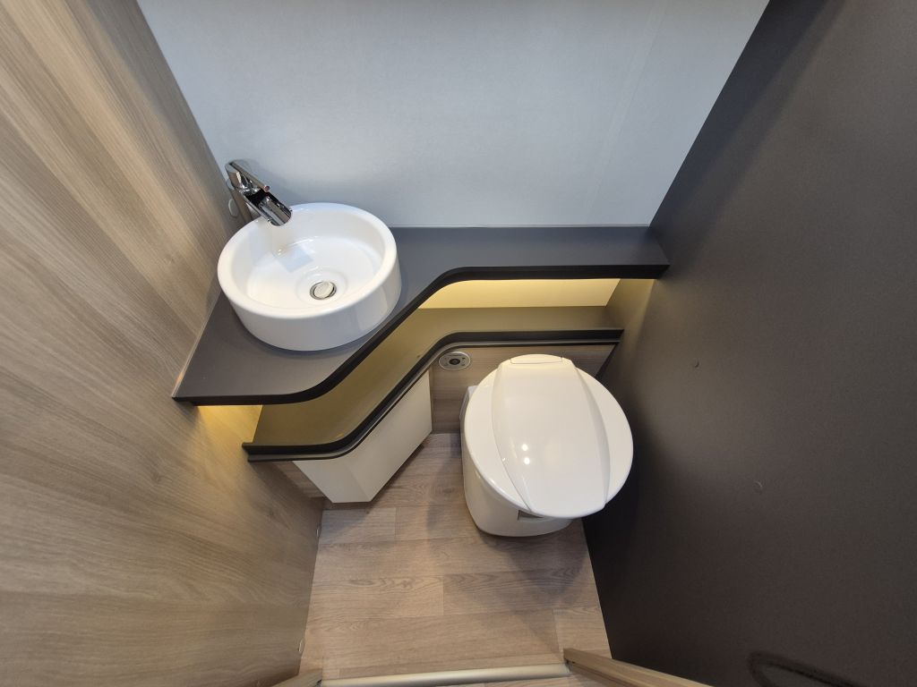 El cuarto de baño de la Itineo JC740 destaca por su espacio de almacenamiento se compone de un compartimento con retroiluminación bajo el lavabo que se completa con un mueble alto con espejo, con toma de 230V esta integrada en el panel superior. Otro aspecto destacado de este espacio es el WC de cerámica, la barra de armario extraíble y que la ducha está separada, ofreciendo mayor privacidad. La columna de la ducha incluye iluminación de ambiente LED azul, con revestimiento laminado negro y compartimentos de almacenamiento integrados. Para iluminar y ventilar la ducha hay una claraboya en el techo.