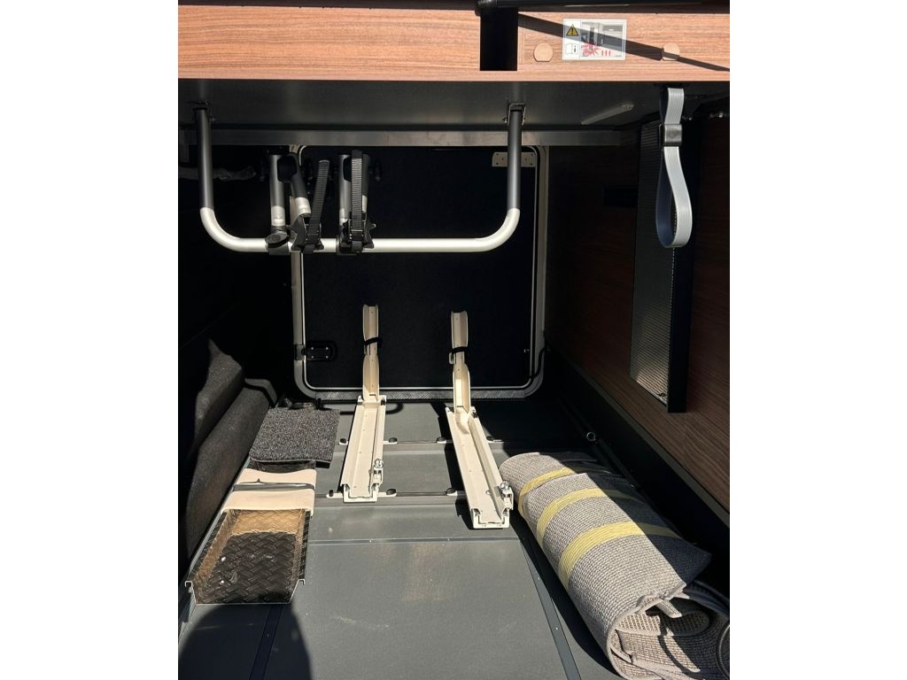 Dispone de un amplio garaje trasero para bicicletas o motocicletas con una carga máxima de hasta 350 kg, puertas de garaje de gran tamaño tanto en el lado del copiloto como del conductor, y suelo del garaje con revestimiento superior e inferior de plástico reforzado con fibra de vidrio con superficie antideslizante.