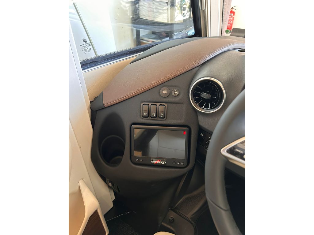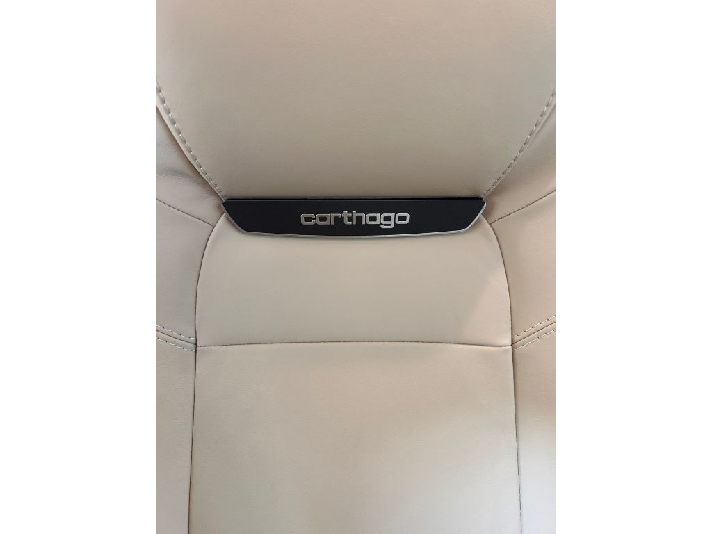 Se han aplicado medidas de aislamiento acústico en el compartimento del motor para mejorar el confort de marcha. Los asientos giratorios Aguti Roadliner para conductor y copiloto, tapizados en el mismo tejido que la sala de estar y con inscripción Carthago, disponen de cinturones de seguridad integrados y reposabrazos tapizados. El salpicadero con sección moldeada revestida de cuero ofrece un diseño elegante y funcional, con práctico compartimento y preinstalación para monitor de cámara de marcha atrás integrado, además de soporte para botellas de agua.