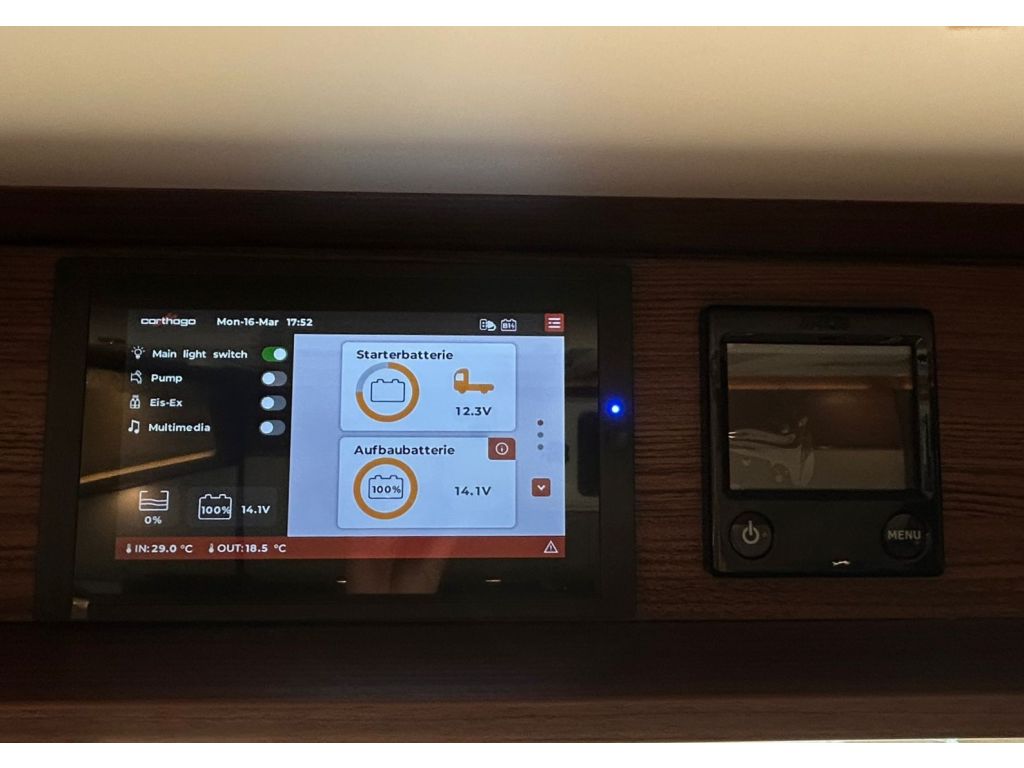 Incluye panel de control digital Truma CP+ para la calefacción por aire caliente, situado detrás del panel técnico encima de la puerta de entrada, y un panel de control digital de 7 pulgadas con pantalla táctil para la consulta de niveles y gestión del sistema a bordo, ubicado también encima de la puerta de entrada.