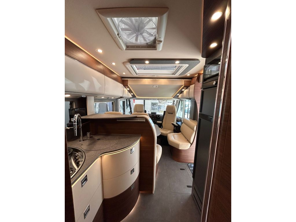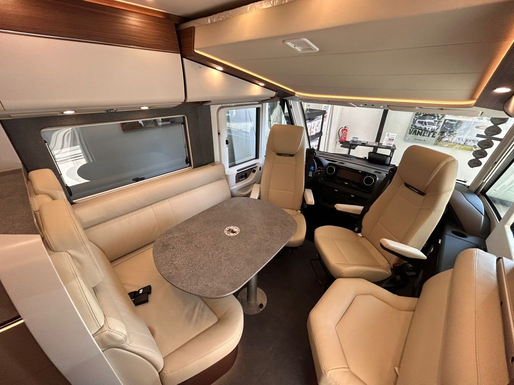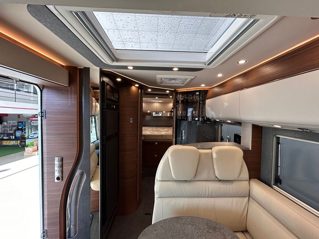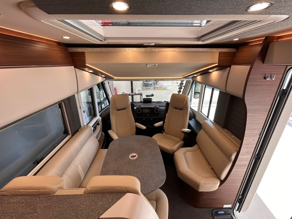 La sala de estar incluye un revestimiento climático de microfibra en el interior de las paredes y el techo, así como una escotilla de techo panorámica Heki-III situada encima del grupo de asientos, acompañada de puntos de luz LED.