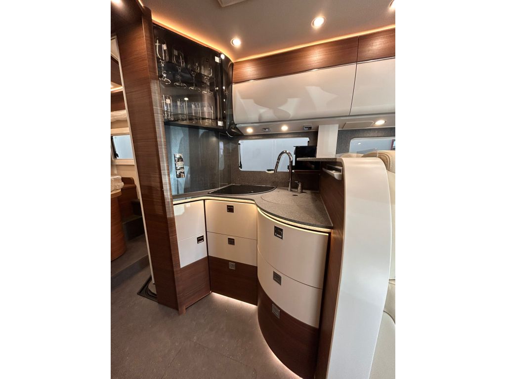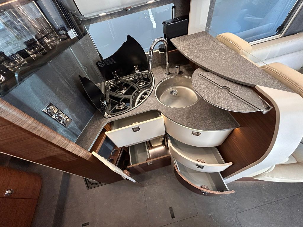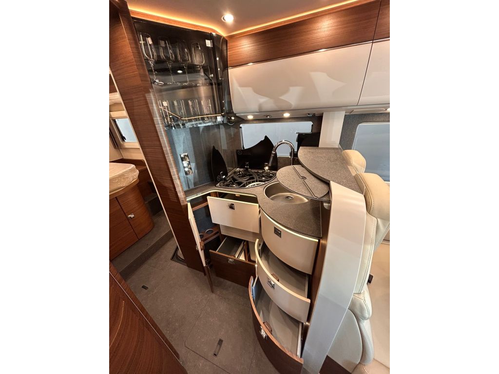 El diseño interior de la Carthago c-line I 5.0 QB disponible en A Coruña sigue un estilo de diseño Amalfi con mobiliario exclusivo en nogal con frentes de los armarios altillos sin tiradores con diseño bicolor en blanco mate con detalles gris pizarra y encimera con acabado de piedra natural gris.