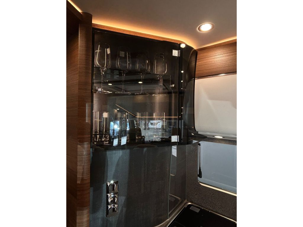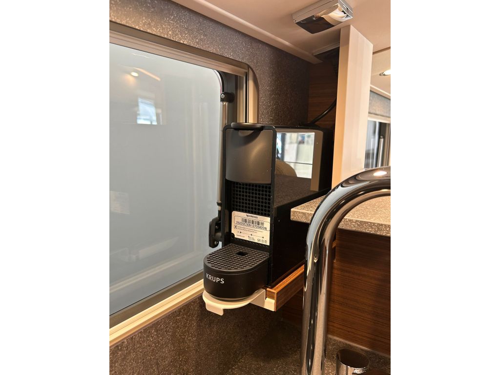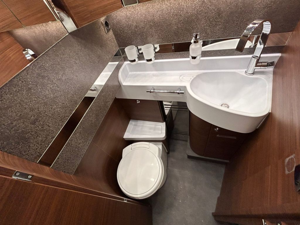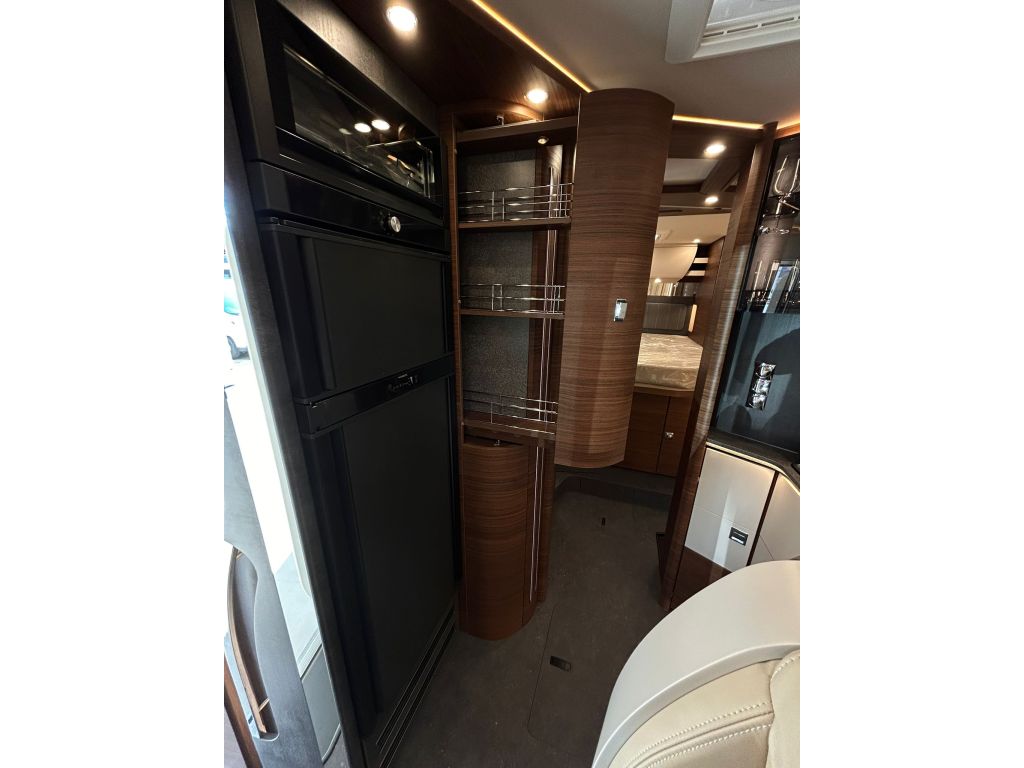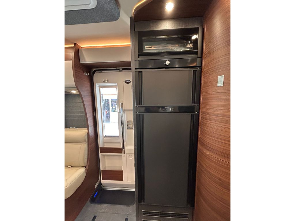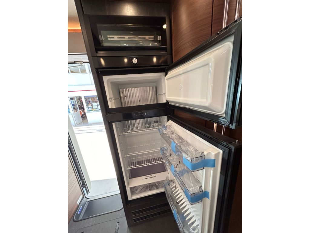 La cocina se completa con una grifería metálica de diseño con grifo extraíble y un frigorífico de gran capacidad con apertura por ambos lados, congelador independiente y búsqueda automática de la fuente de energía, asegurando comodidad y autonomía en cualquier viaje. El vestidor incorpora una puerta divisoria con cerradura, permitiendo separar la sala de estar y crear un ambiente más íntimo y funcional.