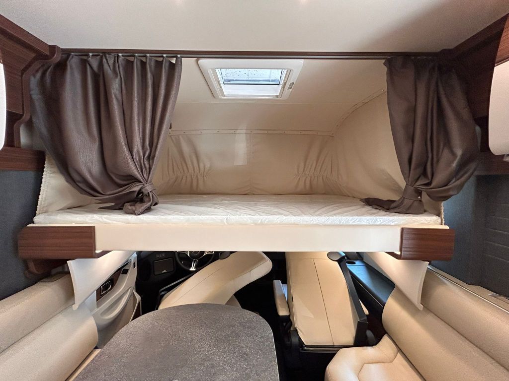 Para una mayor estabilidad y comodidad, incorpora soporte reforzado, estantería para libros y puntos de luz LED, creando un ambiente acogedor y funcional. La cortina frontal permite separar la cama abatible de la sala de estar, aportando privacidad. Esta zona se completa con una escotilla de techo Mini-Heki, que garantiza una óptima ventilación e iluminación natural.