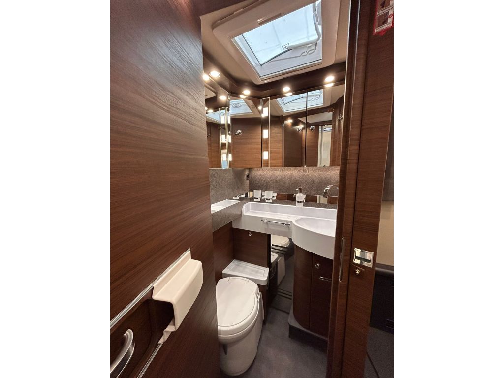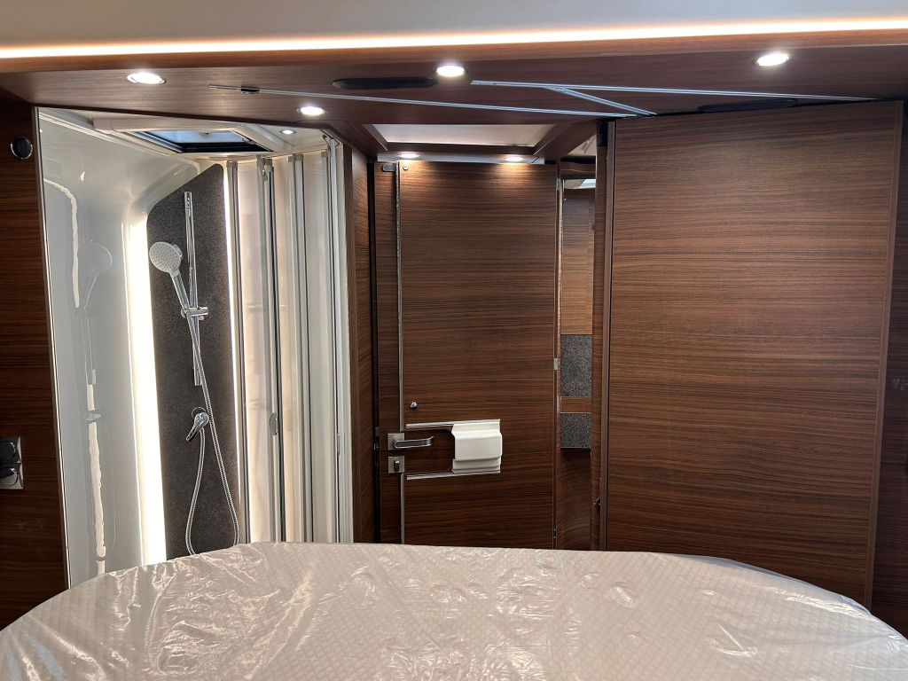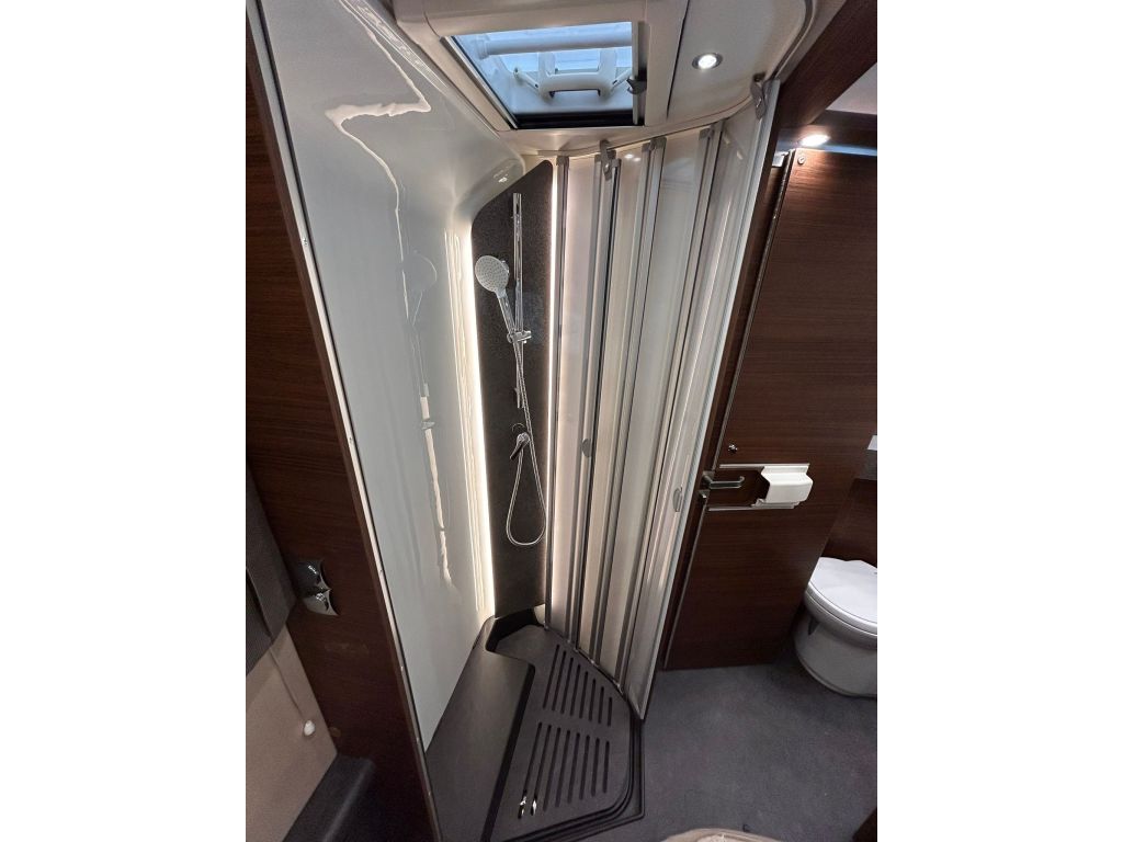 El baño dispone de una ducha independiente con acceso a ras del suelo, que facilita el uso diario y mejora la comodidad a bordo. Incluye toallero circular sobre la ducha, teléfono de ducha regulable en altura sobre barra cromada y un revestimiento impermeable en el suelo de la ducha, con el mismo diseño que la sala de estar. En este modelo el suelo de la ducha es extraíble.