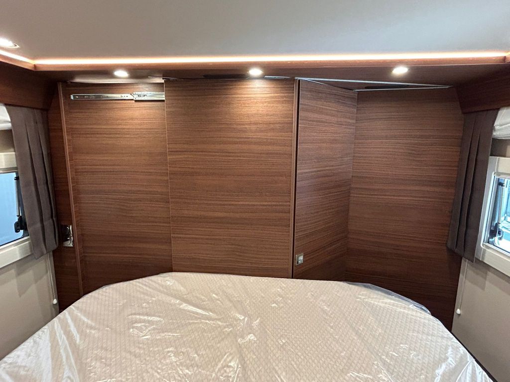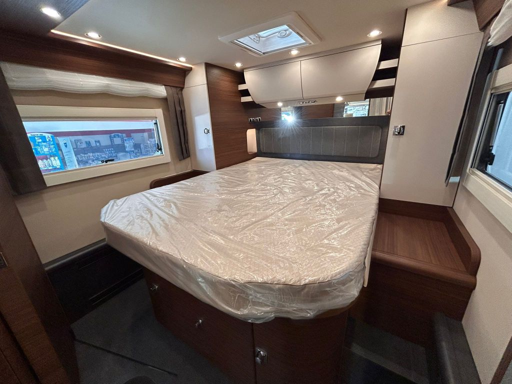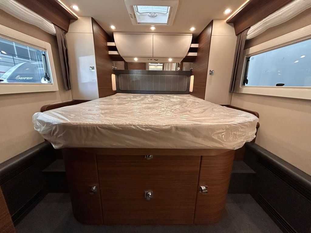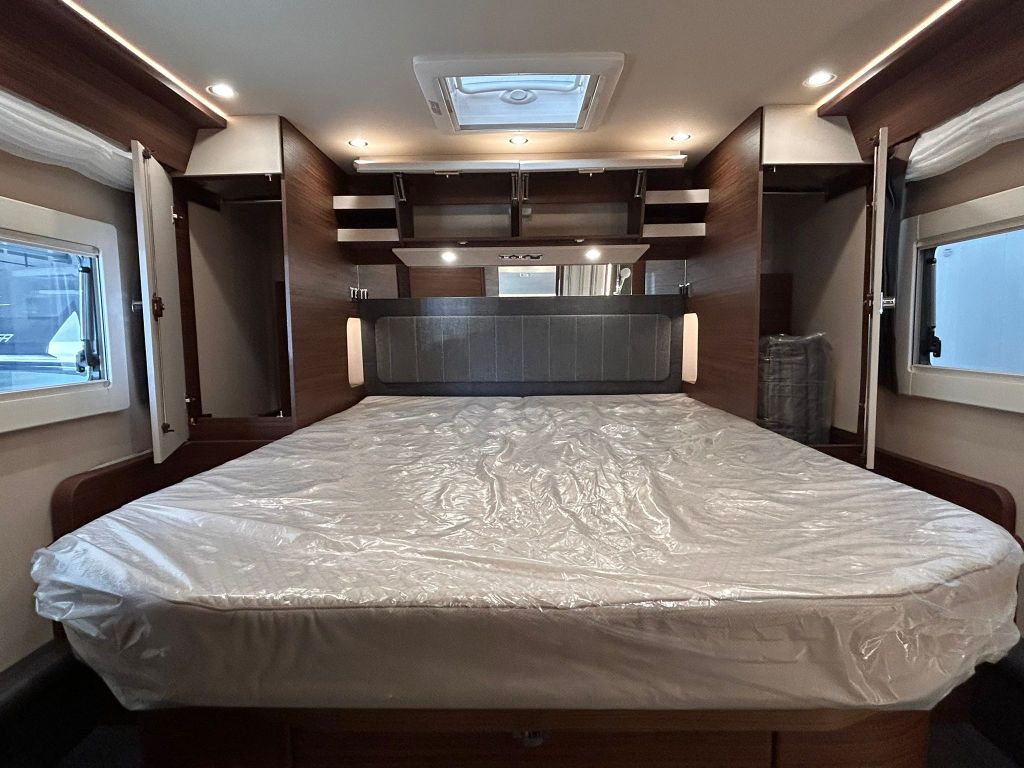 En la parte trasera se encuentra la cama fija, diseñada para ofrecer el máximo confort gracias al sistema de descanso Carawinx con elasticidad puntual, recomendado médicamente, además de estar calefactado y ventilado para un descanso óptimo en cualquier época del año.